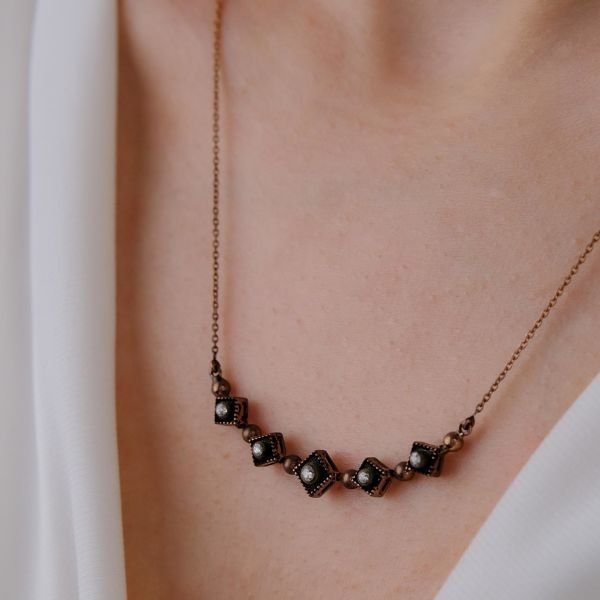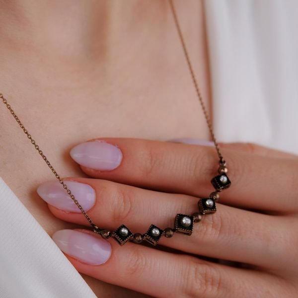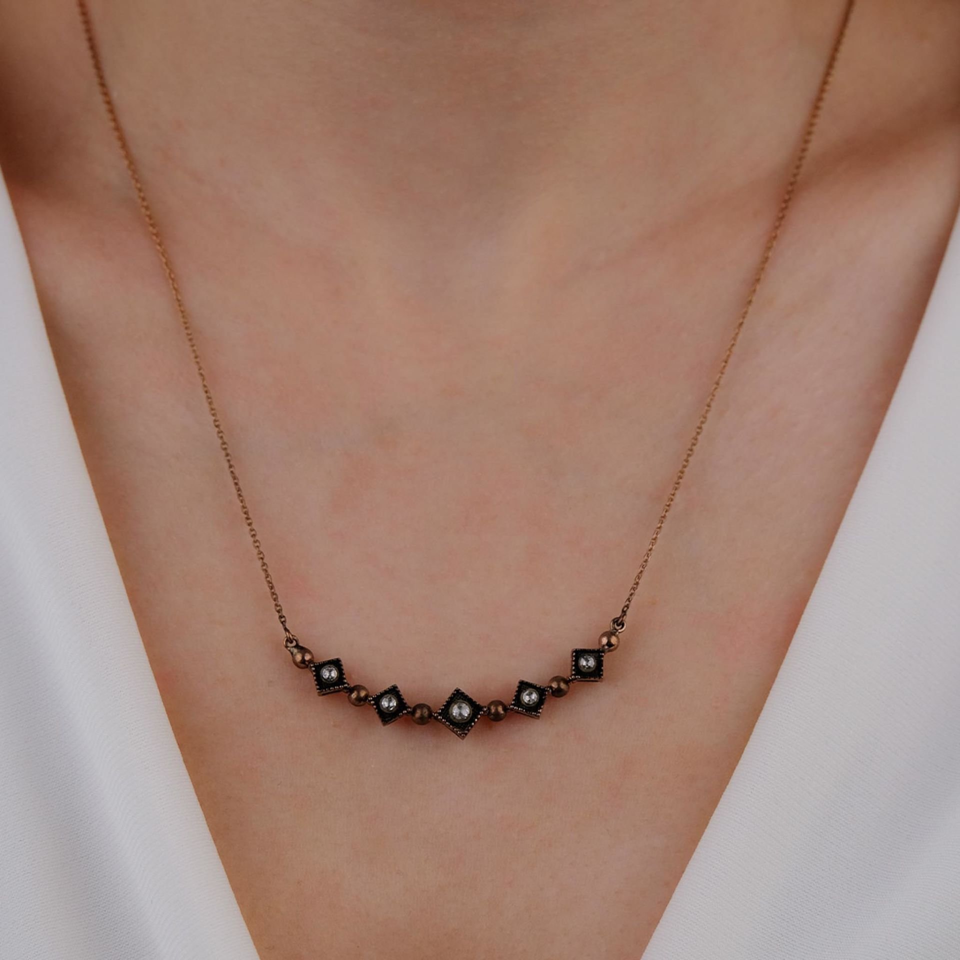 Dörtgen tasarımın modern çizgileri, kolyeyi taşıyan kişinin boynunda sofistike bir ifade yaratıyor. Her bir elmasın titizlikle yerleştirildiği metal çerçeve, kolyeye derinlik ve parlaklık katarken, zarafetini vurguluyor. Yüksek kaliteli malzemelerin kullanılması, kolyenin uzun ömürlü ve dayanıklı olmasını sağlarken, elmasların benzersiz ışıltısı da her anınıza değer katıyor.