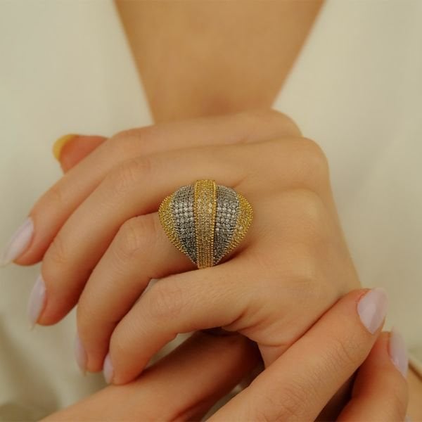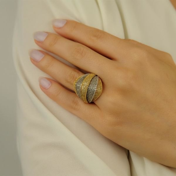 Yüzüğün tasarımındaki iki renkli detaylar, şıklığı ve farklılığı bir araya getirerek modern bir hava katar. Altının sıcak tonları, yüzüğü taşıyan kişinin zarafetini ve stilini vurgular.