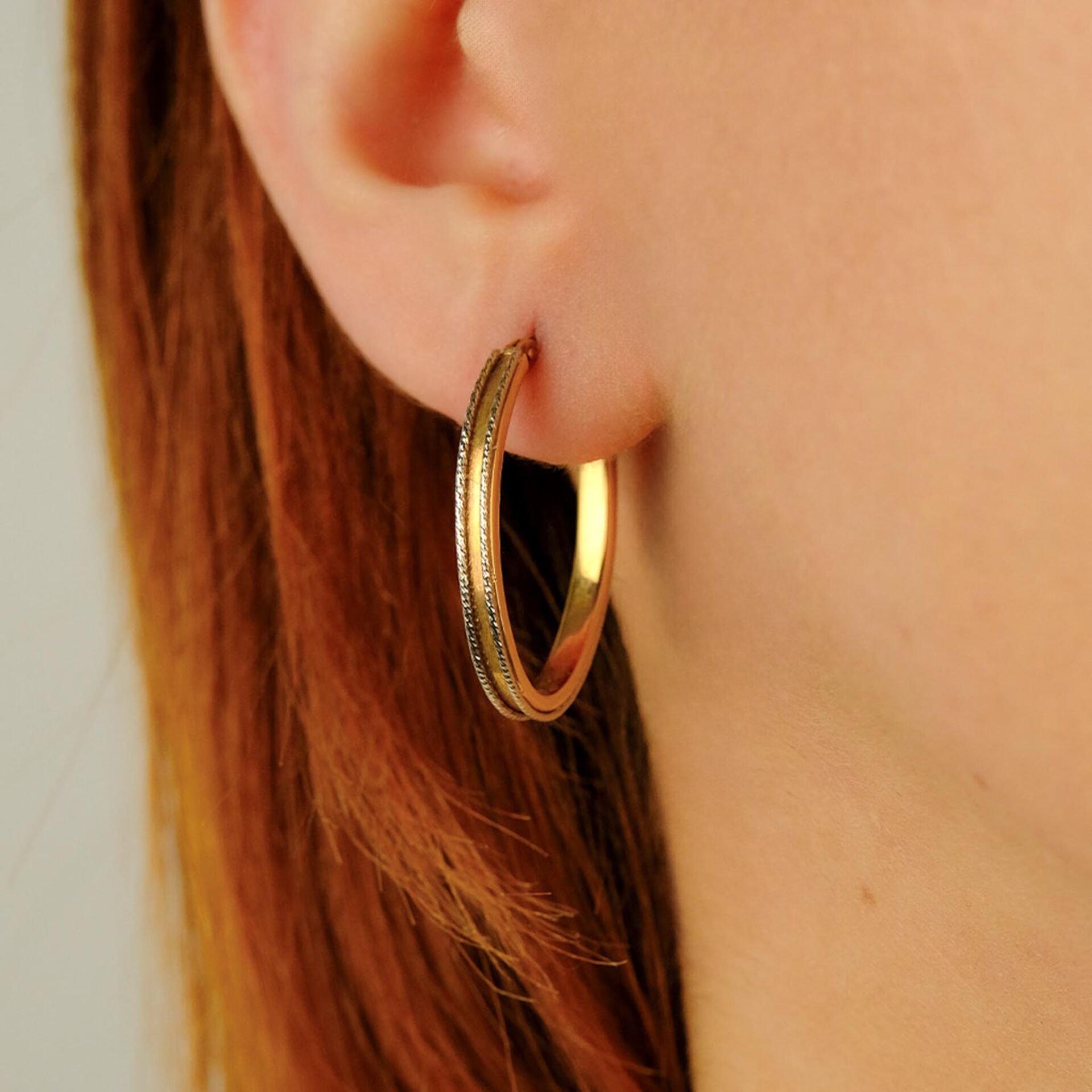 Oval Beyaz Şerifli Halka Sarı Altın Küpe 14 Ayar