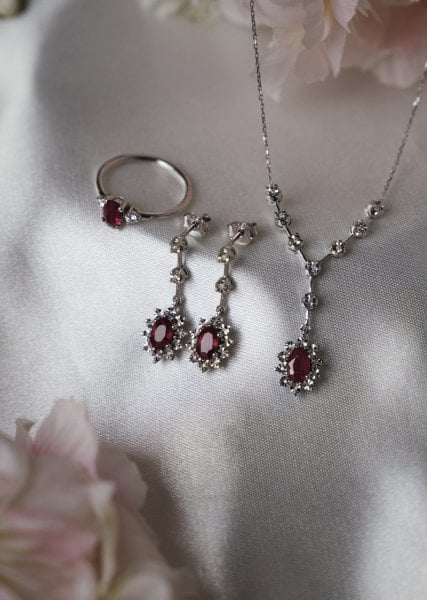 Kolyenin merkezindeki fantezi kesimli yakut pırlanta, benzersiz kesimi ve renk tonuyla öne çıkar. Yakut taşı, zarif ve çekici bir görünüm sunarken, etrafındaki pırlanta detayları da kolyeye lüks bir ışıltı katmaktadır. Altın zincirle birleşen kolye, kullanıcısına zarif bir şıklık ve göz alıcı bir parlaklık sunar.