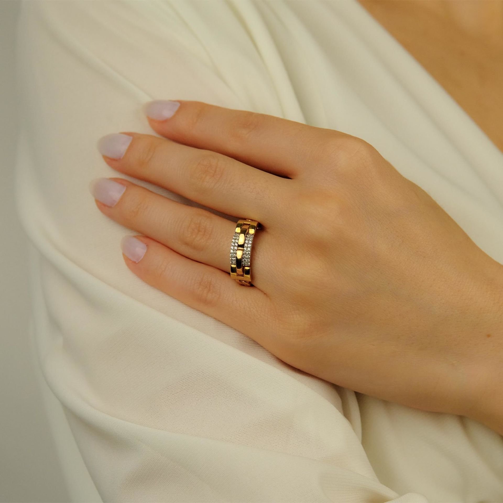 Yüzüğün burgu detayları, parmağı sararak modern ve stil sahibi bir görünüm sağlar. Taşlar, yüzüğe ışıltı ve zarafet katarak dikkat çekici bir etki oluşturur. Altının sıcak tonu, yüzüğü taşıyan kişinin zarafetini ve stilini vurgular.