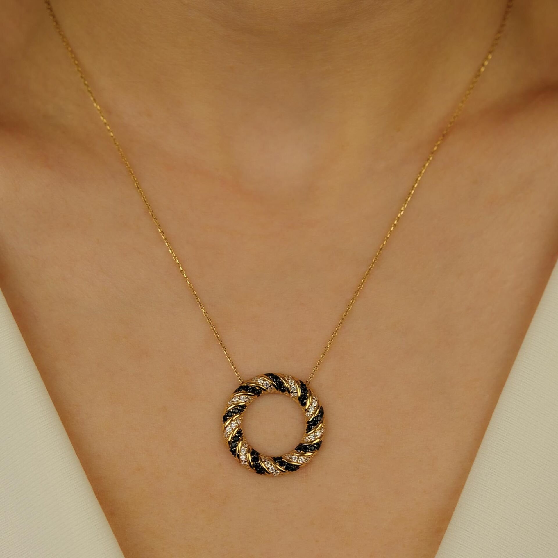 Kolye, yüksek kaliteli altının parlaklığını ve sıcaklığını en saf haliyle sunar. Altın, zarafetin ve dayanıklılığın sembolüdür ve bu kolyeyi özel kılar. Kolyenin ana cazibesi ise üzerindeki halka tasarımı ve parlayan taşlardır. Halka, sonsuzluğu, bütünlüğü ve sürekliği temsil ederken, taşlar kolyenin parıltısını ve ihtişamını artırır.